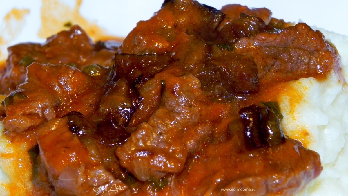 - Шаг 2В этой же сковороде обжарить лук с добавлением слив. масла. Добавить томатную пасту, петрушку и слегка подрумянить. Выложить мясо к луку. Добавить воду, посолить, поперчить, накрыть крышкой и тушить на маленьком огне 1 час