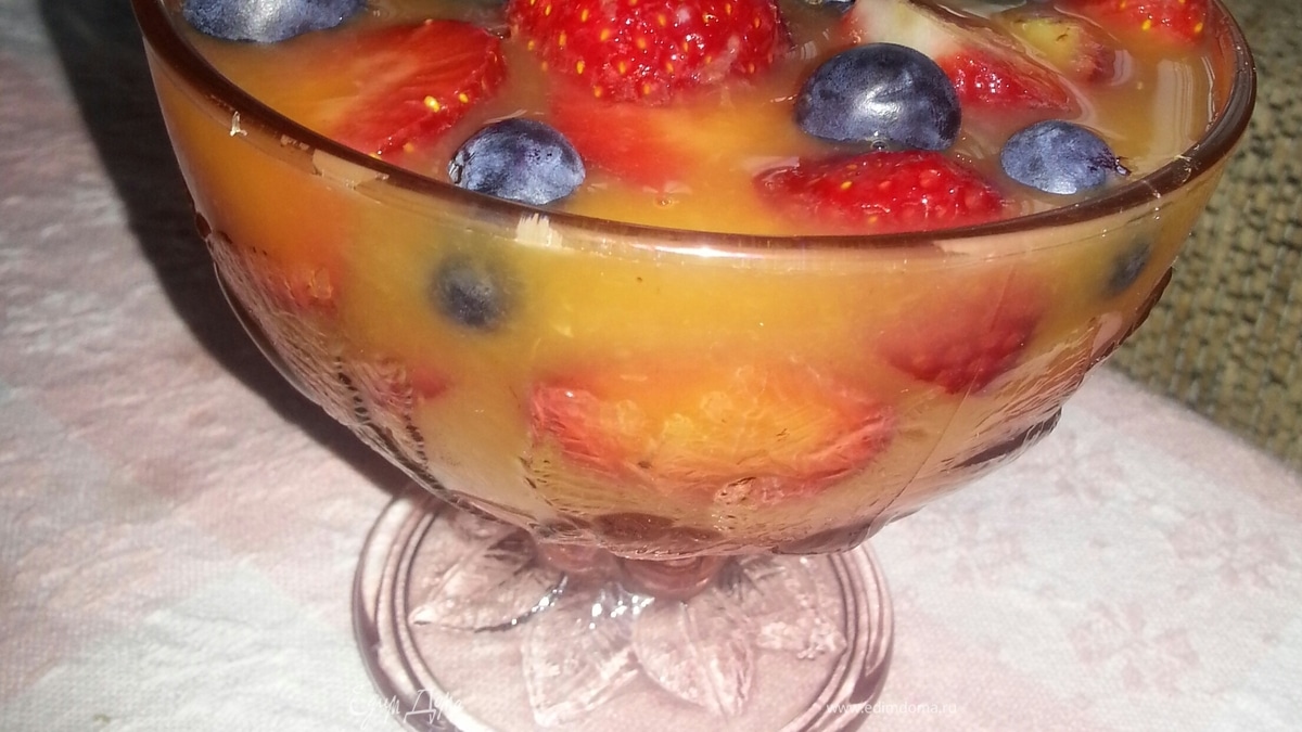 - ПодготовкаРежем наши фрукты на кусочки. Заливаем свежевыжатым соком из апельсина и мандарина, добавляем несколько капель уксуса и в холодильник для охлаждения.