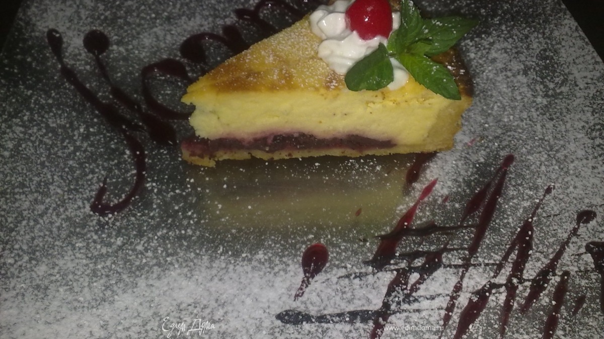 Из полученной массы формируем шар и заворачиваем в плёнку и убираем в холодильник на 30 мин. - Шаг 3Тем временем готовим начинку. Вишни выкладываем в кастрюлю засыпаем сахаром 100 г и ставим на огонь. Разводим крахмал холодной водой и когда вишни начнут кипеть вводим крахмал постоянно помешивая и отставляем когда масса загустеет. Творог делим пополам, одну половину выкладываем в блендер добавляем молоко и пудинг и взбиваем. Выкладываем массу в посуду. Загружаем вторую половину творога в блендер добавляем сахар 200г и желтки. Взбиваем. Обе массы смешиваем.