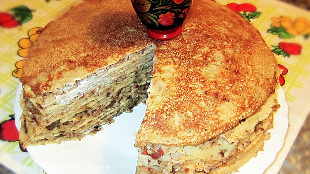 Сложить готовые блины в форму для выпекания или сковороду, перекладывая их слоем начинки. Полученный каравай смазать маслом и на 15 мин поставить в нагретую до 220 гр духовку. - Шаг 13