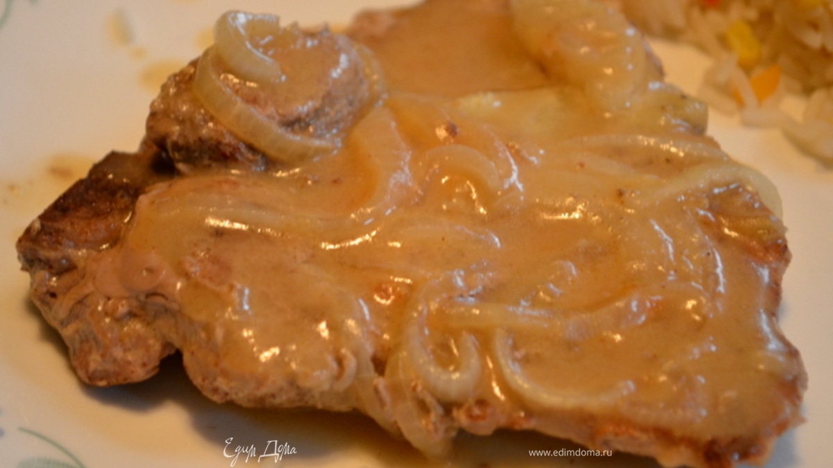 Огонь убавить и добавить на эту же сковороду лук,обжаривать его примерно 4 мин. Затем 3/4 стакана бульона,тушить примерно 2 мин. Добавить молочный микс, размешать,свиные котлеты и тушить пока они не будут готовы.Тонкой нарезки они готовятся оч. быстро. - Шаг 4