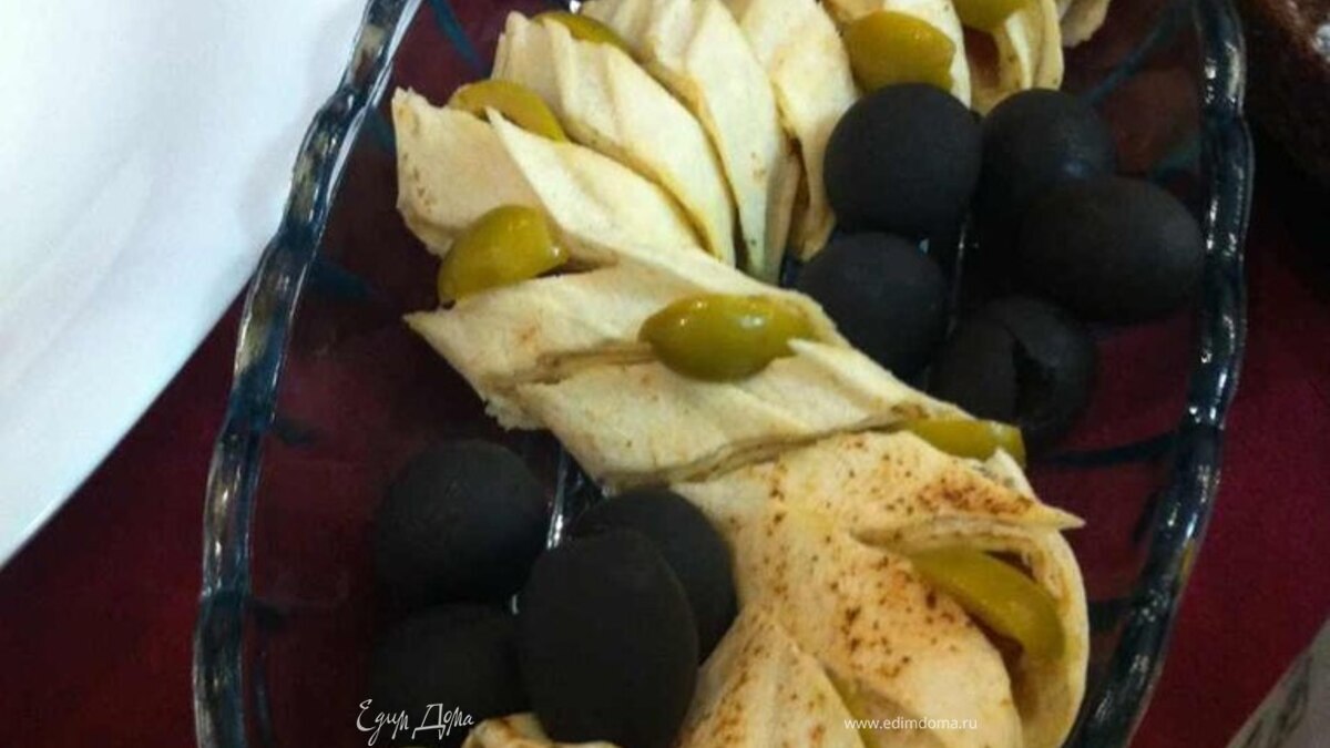 - Шаг 3Разрезаем его на кусочки любой формы. Выкладываем на блюдо в форме змейки и украшаем оливками.