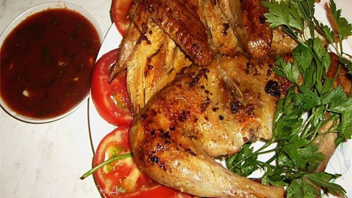- Шаг 1Выпотрошенную и вымытую тушку птицы разрезать по брюшку,распластать,тщательно натереть с обеих сторон чесноком,растертым с солью и перцем.Затем тушку сложить,поместить в полиэтиленовый пакет,завязать и положить на верхнюю полку холодильника на двое суток.По истечении этого срока достать,в сковороду налить растительное масло слоем примерно 1-1.5 см,нагреть его,затем опустить в него распластанную тушку птиц,предварительно сняв с ее повехности избыток чесночной массы.Выложить цыпленка на разогретую сковороду с маслом. Сверху придавить грузом (если у вас нет специальной сковороды), можно кастрюлей с горячей водой. Жарить 15-20 минут на одной стороне, затем перевернуть.