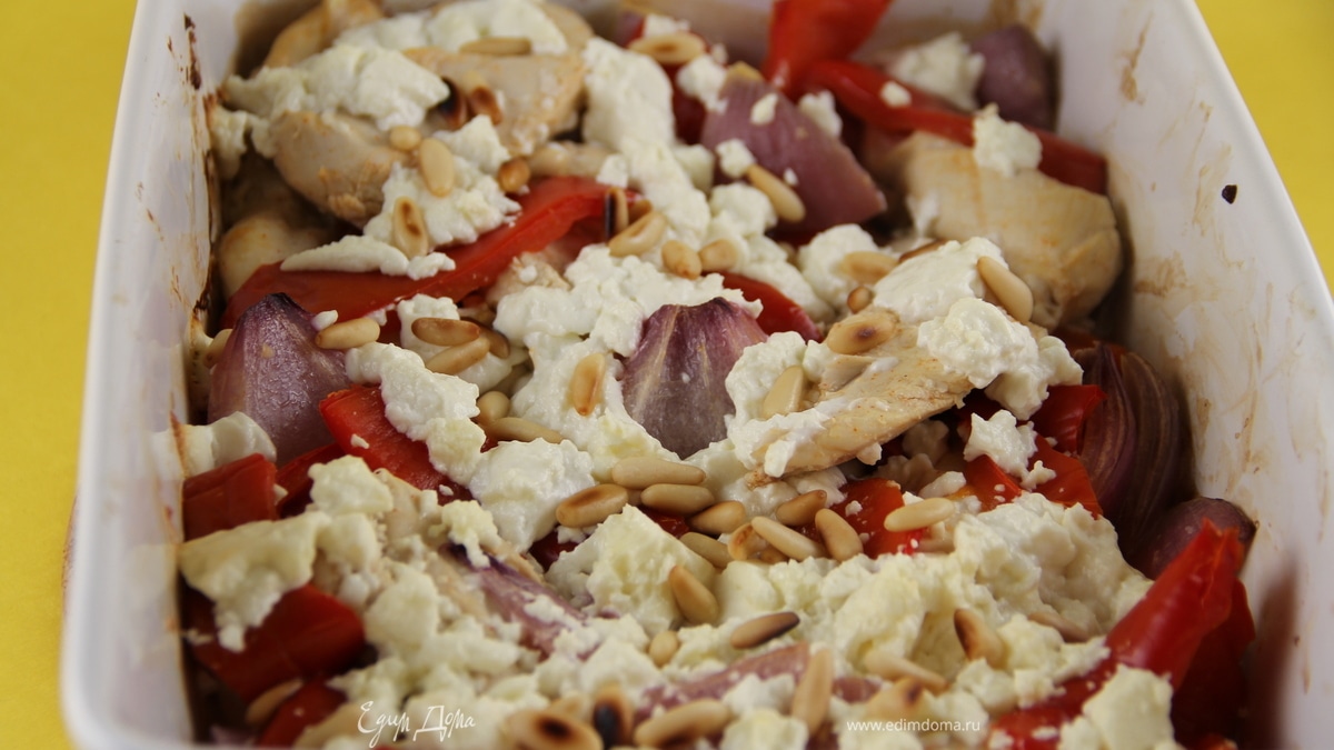 Запеченное куриное филе (бедрышки, голени) с перцем, фетой и кедровыми орешками