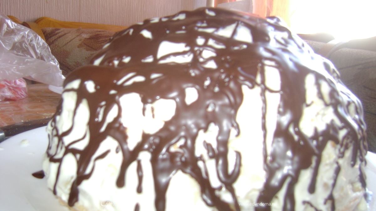 - Шаг 3Растопить шоколадку и украсить. Сверху мажем кремом и глазурью. Ну вот и все, тортик готов!!!! Дать настояться часа 2-3 (если успеете спрятать).