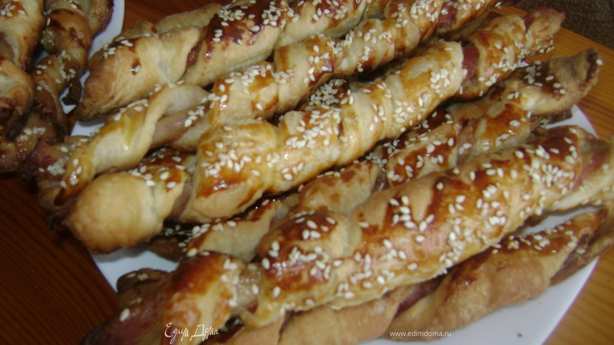 - ПодготовкаСлоенное тесто раскатать, выложить на него бекон, разрезать на полоски, равные по ширине бекону, скрутить жгутиком.