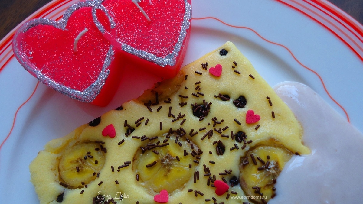 Нарезаем наш блин на порции, подаем с соусом, я еще украсила шоколадным штрейзелем)) Вот такой вот нехитрый завтрак для любимого)) Bon appetit!!!