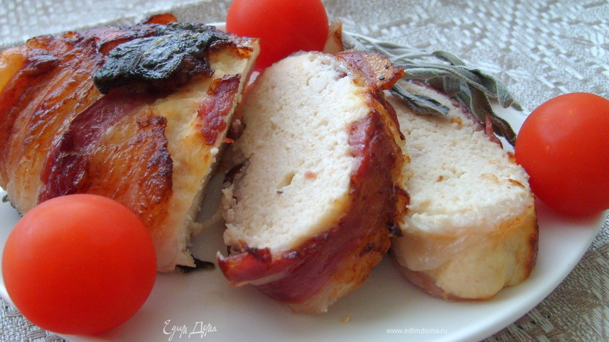 Поверх бекона уложить сформированный куриный рулет, плотно обернуть его беконом. Сверху выложить листья шалфея.