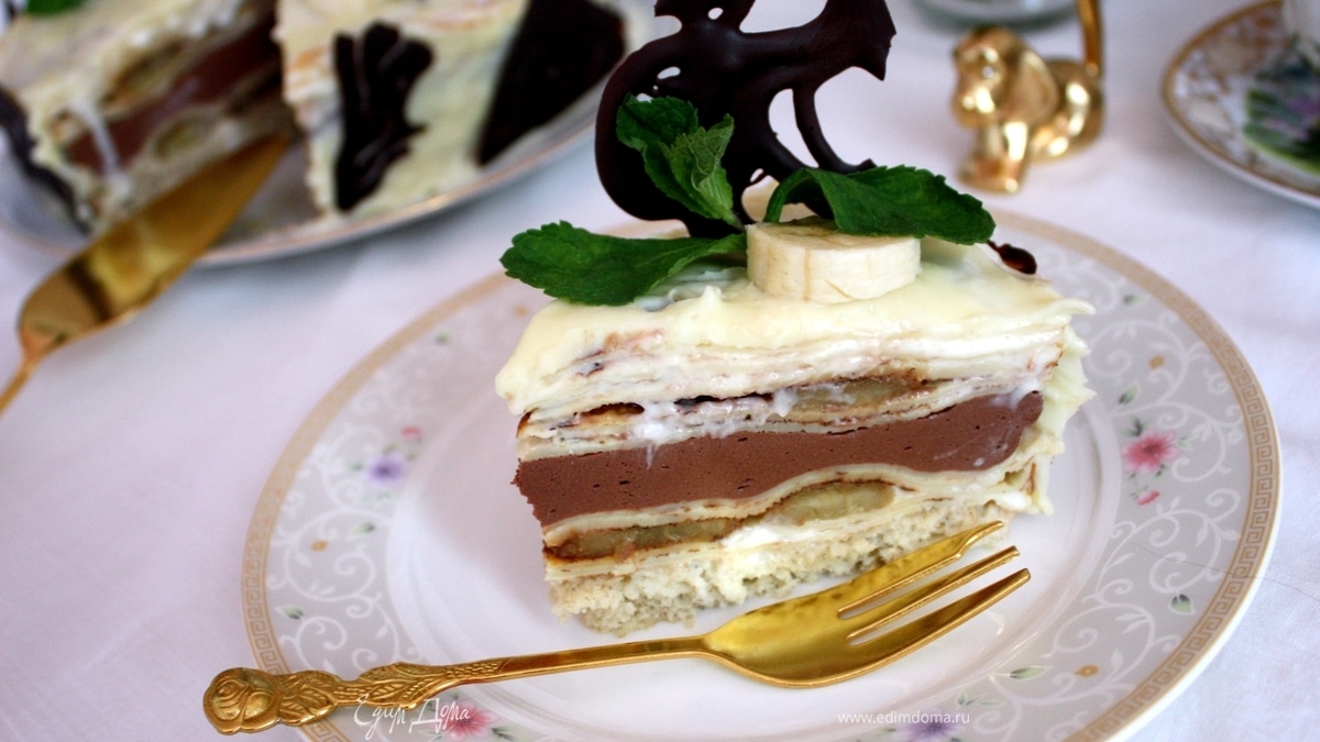 У меня давно была задумка сделать блинный торт,но какой-то особенный...Я много делала и сладких и несладких тортов,просто прроомазывая их различными начинками. Но душа требует чего-то этакого...Четыре дня я проходила,продумала и начала творить! Здесь смесь нескольких тортов,я объединила несколько вариантов,что-то убрала,что-то добавила и вуаля! Торт готов! Мои вкусы удовлетворил на 100%,очень нежный,в меру сладкий и оригинальный по своему составу. Идеи позаимствованы были у Нины Тарасовой, Иры Чадейки, рецепт блинчиков принадлежит нашей Надежде!!! Итак,торт: от стоит на ванильном бисквите.пропитанном амаретто,далее апельсиновые блинчики, промазанные ванильным заварным кремом,бананы в карамели,шоколадный мусс и покрытие из белого шоколада....