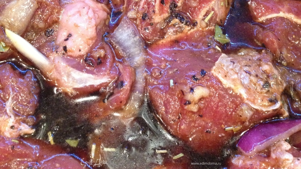 Переложить мясо в посуду для маринования. Очистить лук и чеснок. Лук разрезать на крупные кусочки, затем разламывая их руками (чтобы вышел сок) добавить к мясу вместе с выдавленным чесноком. Добавляем все остальные ингредиенты и смешиваем всё желательно руками, как бы вдавливая продукты в мясо. - Шаг 1