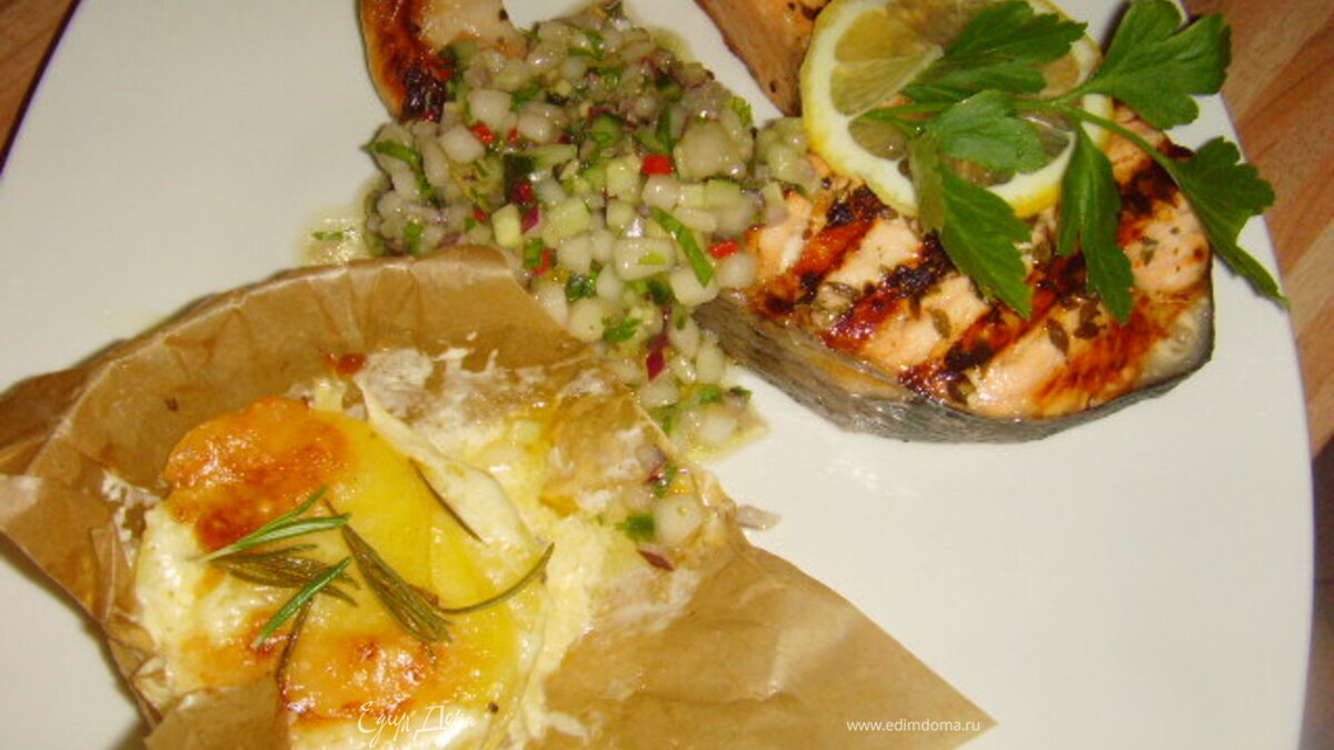 Стейк из лосося с грушевой сальсой и картофельным гратеном