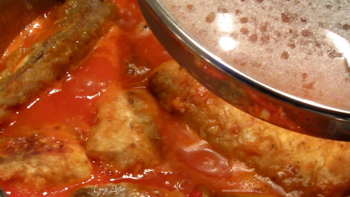 Добавить помидоры. Слегка протушить без крышки. Добавить соль, сахар, лавровый лист, перец горошком, укроп, базилик и немного воды, чтобы получился соус. - Шаг 4