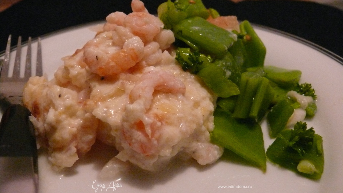 - Шаг 11.Мелко нарезать лук, чеснок.В сковороду налить оливковое масло, всыпать овощи, довести до прозрачности, добавить мелко нарезанные морковку и сельдерей. Потомить, но не дать зазолотиться.Добавить муку, пару минут подержать на огне, помешивая и добавлять постепенно молоко.Должна получиться консистенция соуса.Добавить соль, перец, зелень 2. Смазать форму для запекания раст. маслом. Выложить филе.Немного присолить.На каждый кусочек филе положить креветки.Сверху залить соусом. 3.В разогретой духовке запекать рыбу минут 20-25.