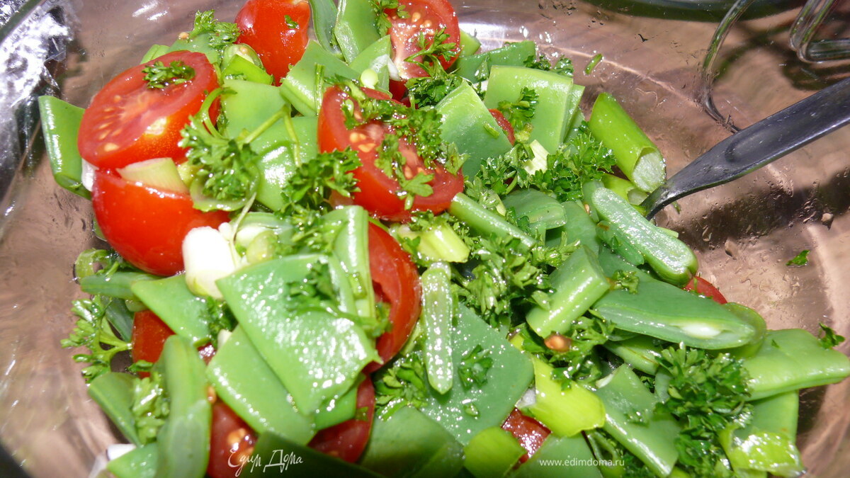 - Шаг 11.Стручковую фасоль отварить, но не переваривать.Я люблю, чтобы она еще немного хрустела, но это кому как нравится. Слить воду, обдать холодной водой. Порезать наискосок.Заправить оливковым маслом, цедрой, солью и соком лимона.Дать настояться 2.Добавить черри и петрушку. Думаю, что можно чеснок, но не пробовала)))