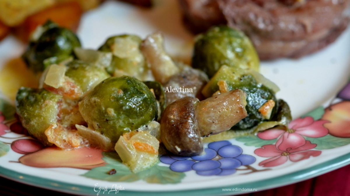 Добавить вино и тушить 1 мин. Вернем грибы, брюссельскую капусту после духовки, сливки. Тушим 5 мин. - Шаг 4