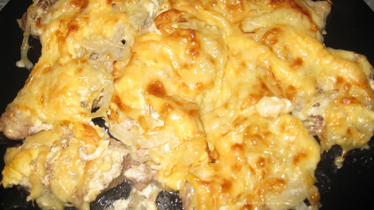 - ПодготовкаМясо помыть,обсушить. Нарезать ломтиками 1-2 см. Каждый кусок отбить с двух сторон. Выдавить чеснок и перемешать с перцем. Смазать смесью каждый кусок. На противень кладем пергамент. Выкладываем на него мясо. Слегка посолить. Кладем нарезанный полукольцами лук. Смазываем майонезом. Мясо с луком сверху посыпаем тертым сыром. Поставить мясо в разогретую духовку. Выпекать 40-50 минут,при 180 с.