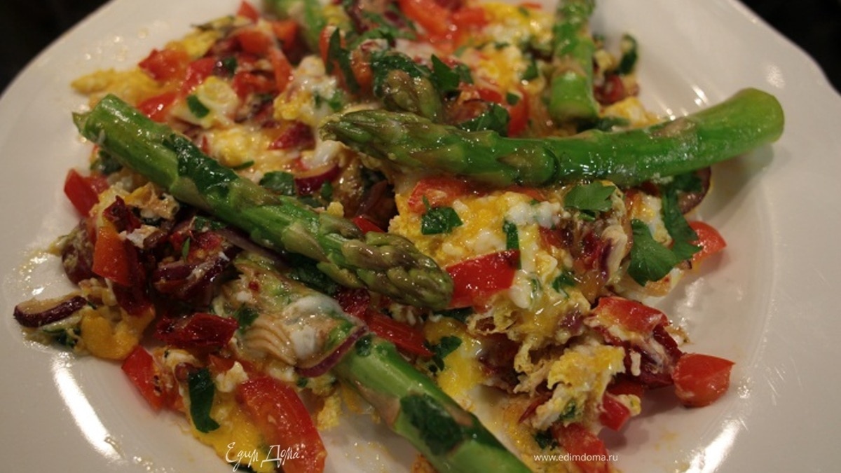 Жареные яйца со спаржей, сладким перцем и вялеными помидорами