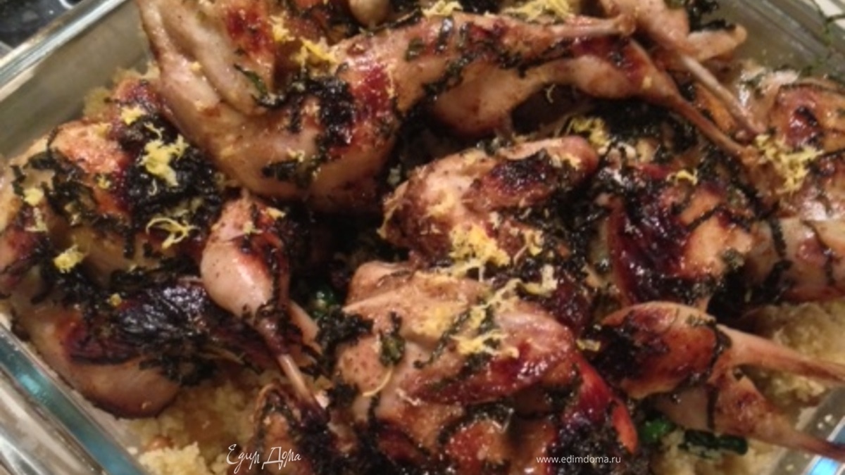 Положить кускус на блюдо, сверху выложить перепелов. Посыпать мелко натертой цедрой лимона и полить лимонным соком ( 2-3 ч.л.). Приятного аппетита!