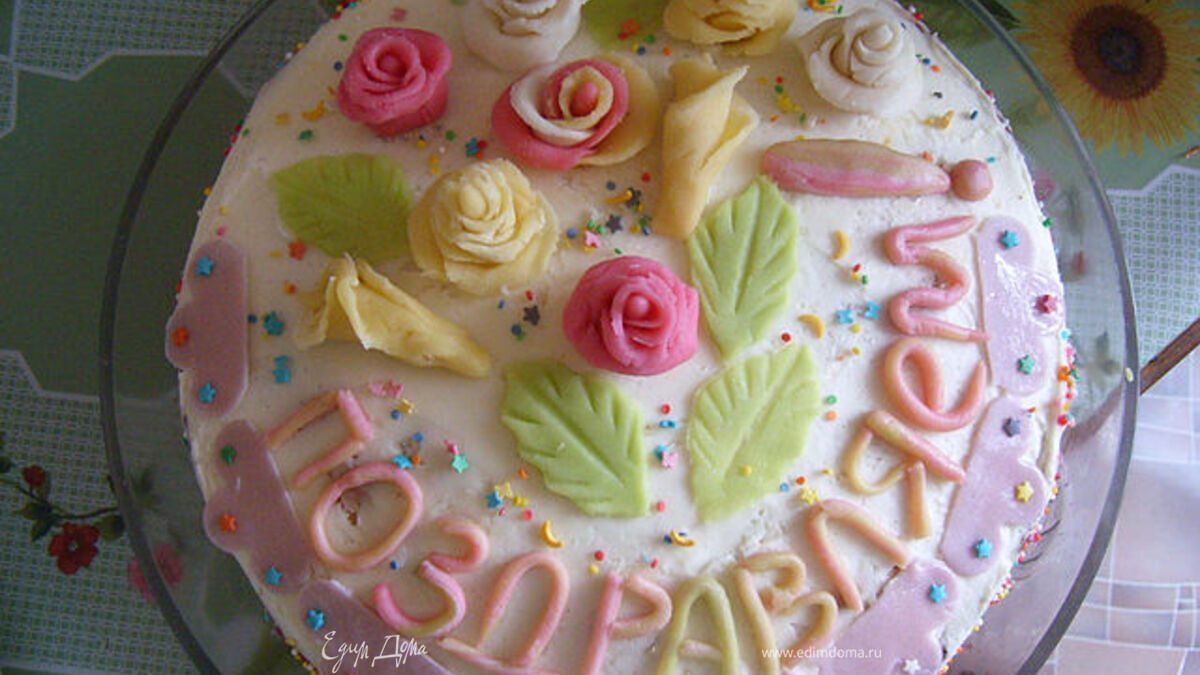Начать собирать торт: Нижний корж пропитать сиропом, промазать кремом, выложить творожную начинку. Её тоже хорошенько смазать кремом, сверху уложить второй корж. Пропитать его сиропом, обмазать весь торт остатками крема и украсить по своему желанию. У меня это был первый опыт работы с мастикой.))))