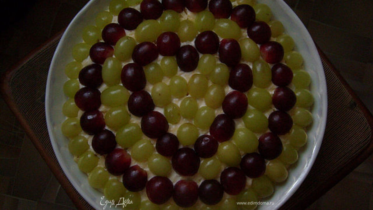 - Шаг 5Сверху уложить разрезанные пополам виноградины.