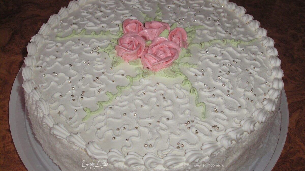 - Шаг 3Сметану взбить с сахаром и ванилью. Переложить коржи. При желании можно торт украсить. Бусинки купить можно в супермакете.Зеленьій цвет-сок шпината,красньй-свекольньій.
