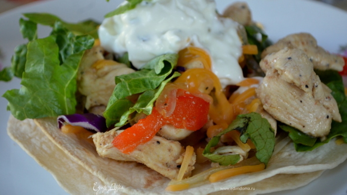 Готовые овощи и куриные грудки сбрызнуть соком лайма. Выложить на теплые лепешки,подавать со сметаной,сыром и салатом.приятного аппетита.