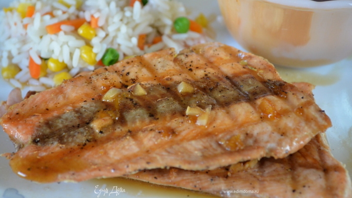 Готовим на гриле, то 4 мин. сторона. Если в духовке, при тем-ре 200 гр. примерно 15 мин. Перед подачей опять смажем глазурью и подаем с гарниром. Приятного аппетита.