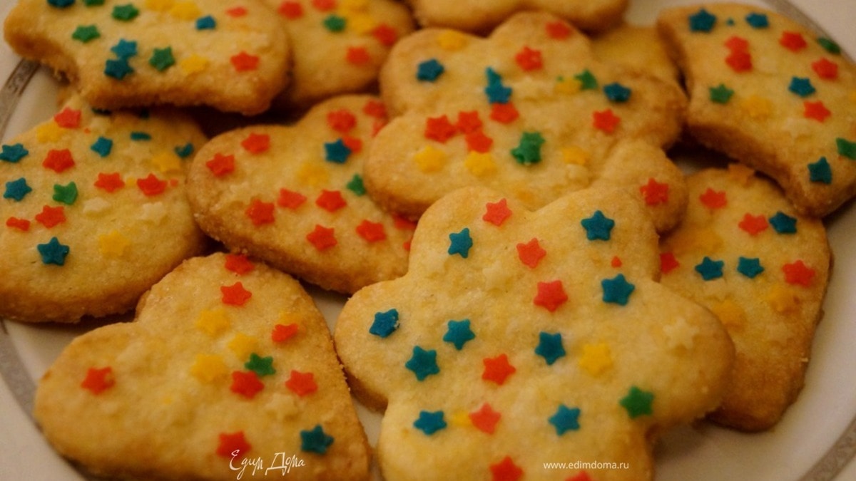 - Шаг 3Выложить печенье на противень, выстланный бумагой для выпечки, присыпать его сверху разноцветной сахарной посыпкой и выпекать в разогретой духовке 13-15 минут.