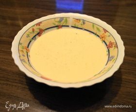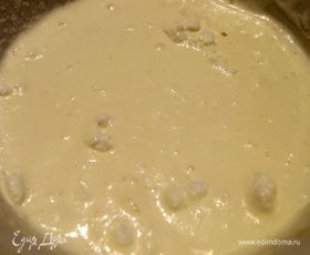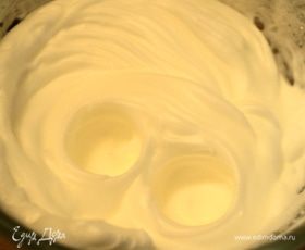 В желтки добавить размятый маскарпоне, хорошо взбить миксером. Добавить, аккуратно вмешивая, взбитые белки и хорошо взбитые сливки
