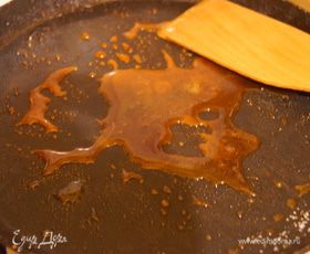 В толстодонной кастрюле растопить сахар, до коричневого цвета, добавить кипяток