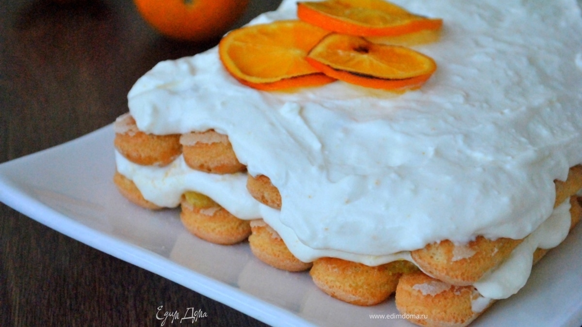 Собрать десерт: Выложить слой печенья на тарелку (или в форму). Обильно смочить апельсиновым соком, выложить половину апельсиновых долек, половину крема. Слой повторить еще раз: печенье, сок, апельсины, крем.