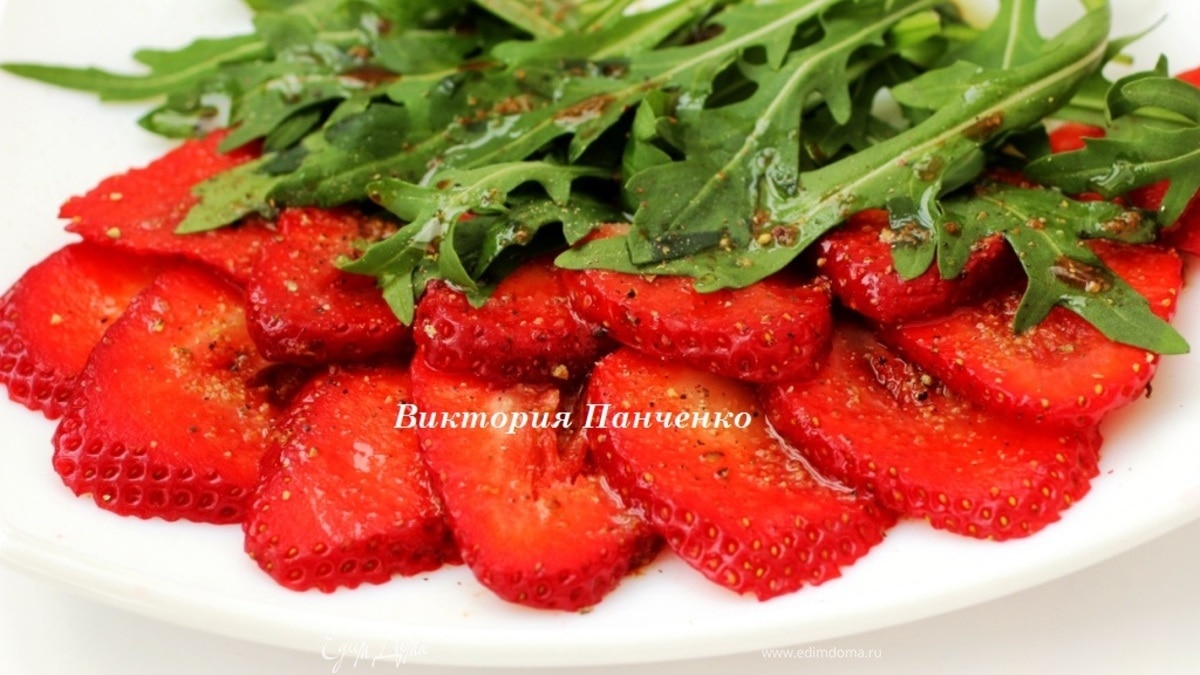 Выложить на плоское блюдо ломтики клубники внахлест, сверху положить руколу, всё обильно полить пряной заправкой и подавать немедленно.