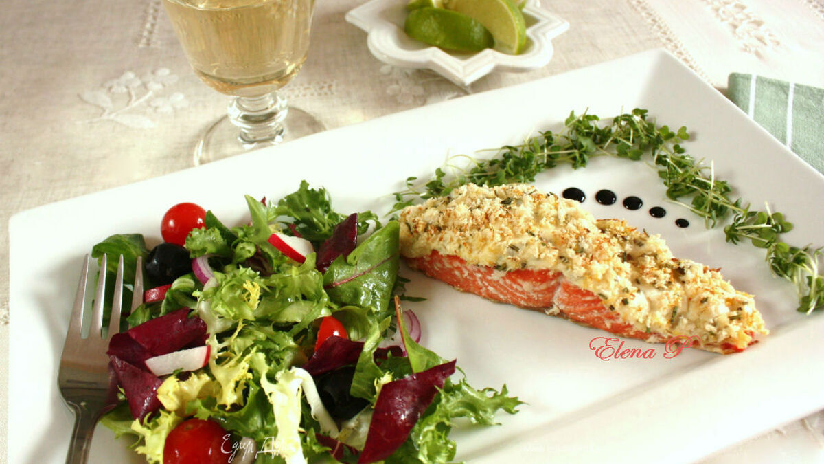 Участник конкурса "Ужин за полчаса". Приготовить быстрый ужин совсем несложно и его можно сделать почти праздничным, если завершить нарядным, вкусным десертом. Основное блюдо запекается в духовке около 20 мин. и этого времени достаточно, чтобы "сочинить" салат и десерт. Лишь бы все продукты были под рукой. Не верите? Читайте и смотрите дальше!))) При покупке рыбы советую не забыть и соус тартар, чтобы не тратить время на его приготовление. Он подходит ко многим рыбным блюдам. Ну, а если желаете только домашний, тогда прибавляйте дополнительные минуты и выбирайте рецепт в интернете. Безе у меня почти всегда есть в наличие-это очень удобно. Излишки яичных белков от других блюд уходят на него. После подсушивания складываю в герметичную банку и использую, когда мне нужно. Да!!! Лосось назван "слоёным", поскольку поверх филе выкладывается слой сырной массы, а потом слой крошек. Всё вместе превращается в нечто вкусное: этакая рыхлая корочка на нежно-пикантном соусе. Для чистоты эксперимента сначала приготовила " под прицелом" фотокамеры, а сегодня уже просто на скорость, для уточнения времени.)))