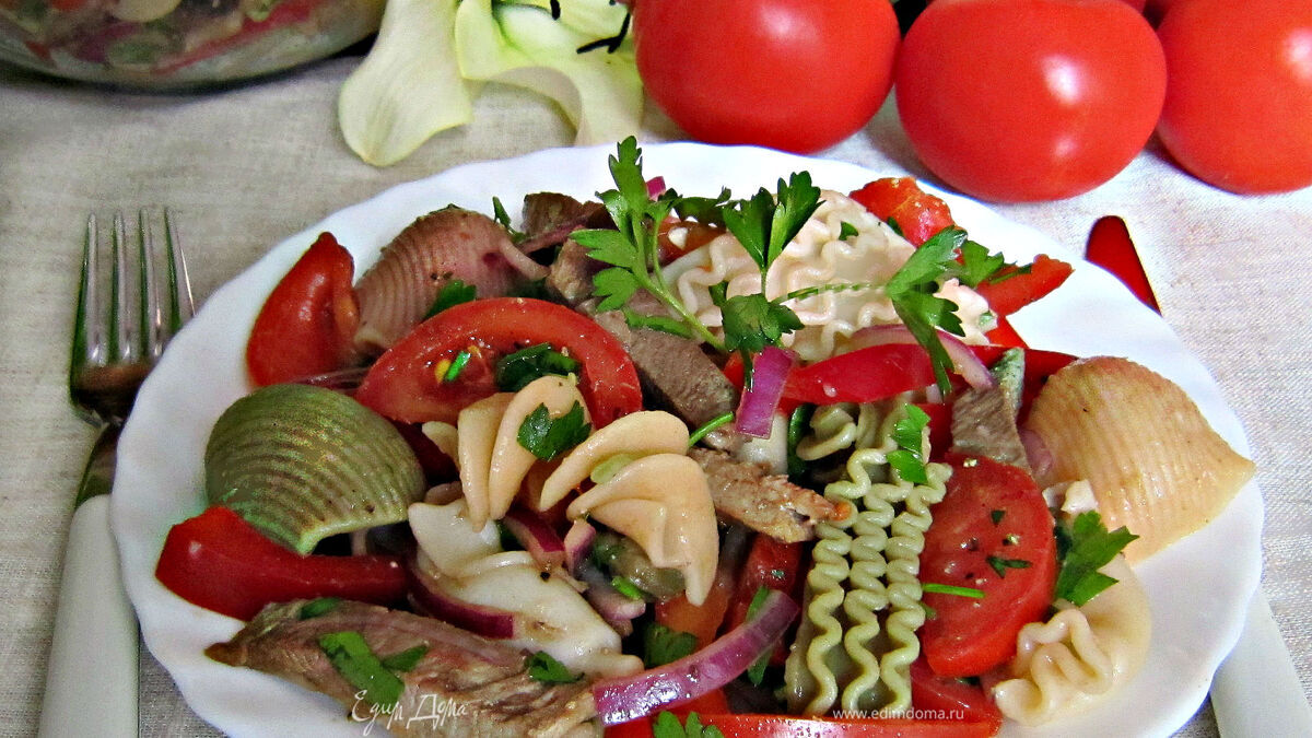 В салатнике смешать приготовленную пасту, мясо, лук, помидоры, перец, каперсы, зелень. Добавить по вкусу соль, перец, оставшуюся 1 ст л оливкового масла и перемешать. Приятного аппетита!