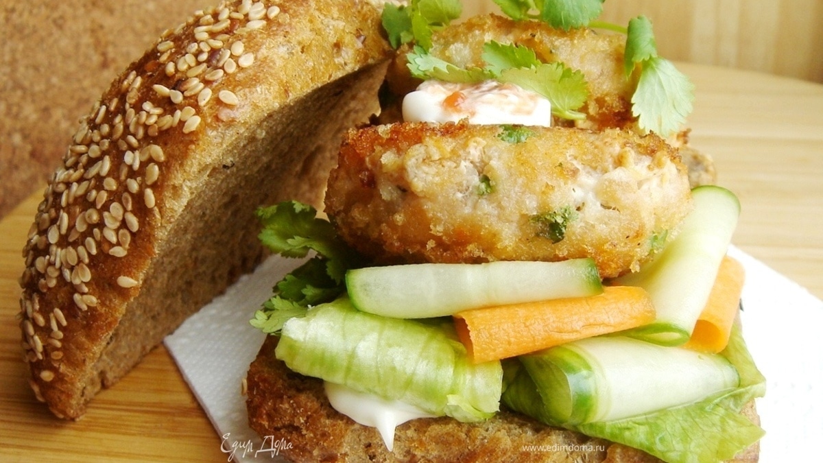 Булки разрезать , нижнюю часть смазать соусом. Выложить на каждую булку по листу салата, ломтики огурца и моркови, по 2 рыбные котлетки. Смазать котлетки соусом, украсить оставшимися веточками кинзы и накрыть верхней частью булки. Приятного аппетита!