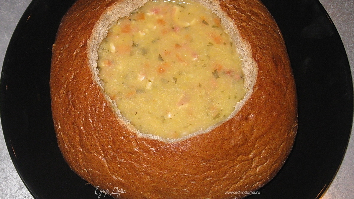 В кипящий бульон кладем горох и варим без добавления соли до готовности, затем добавляем овощи, соль, перец, лавровый лист, чеснок и варим еще 20 минут. При подаче разливаем в предварительно вырезанный хлеб.