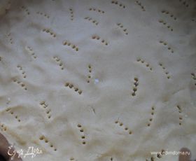 Вынуть тесто из холодильника, большую часть раскатать, сделать бортики и поместить в форму ( 26 см) на лист бумаги для выпечки. Проколоть тесто в нескольких местах.