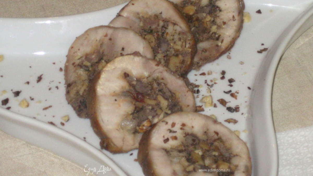 Кладем начинку на край отбитого филе из кролика. Заворачиваем в длину.