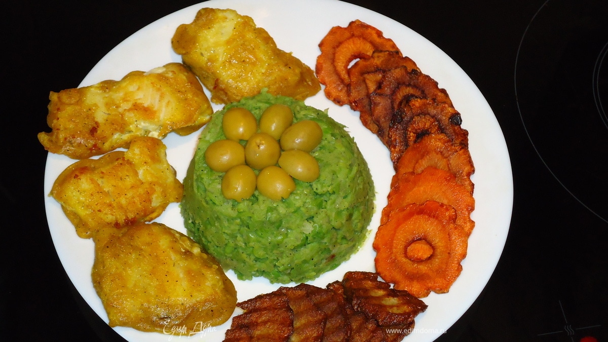- Шаг 5собираем блюдо: пюре из горошка выложить в формочку. из формочки выложить на тарелку, посередине вокруг выложить рыбу, морковку, картошку, оливками украсить.