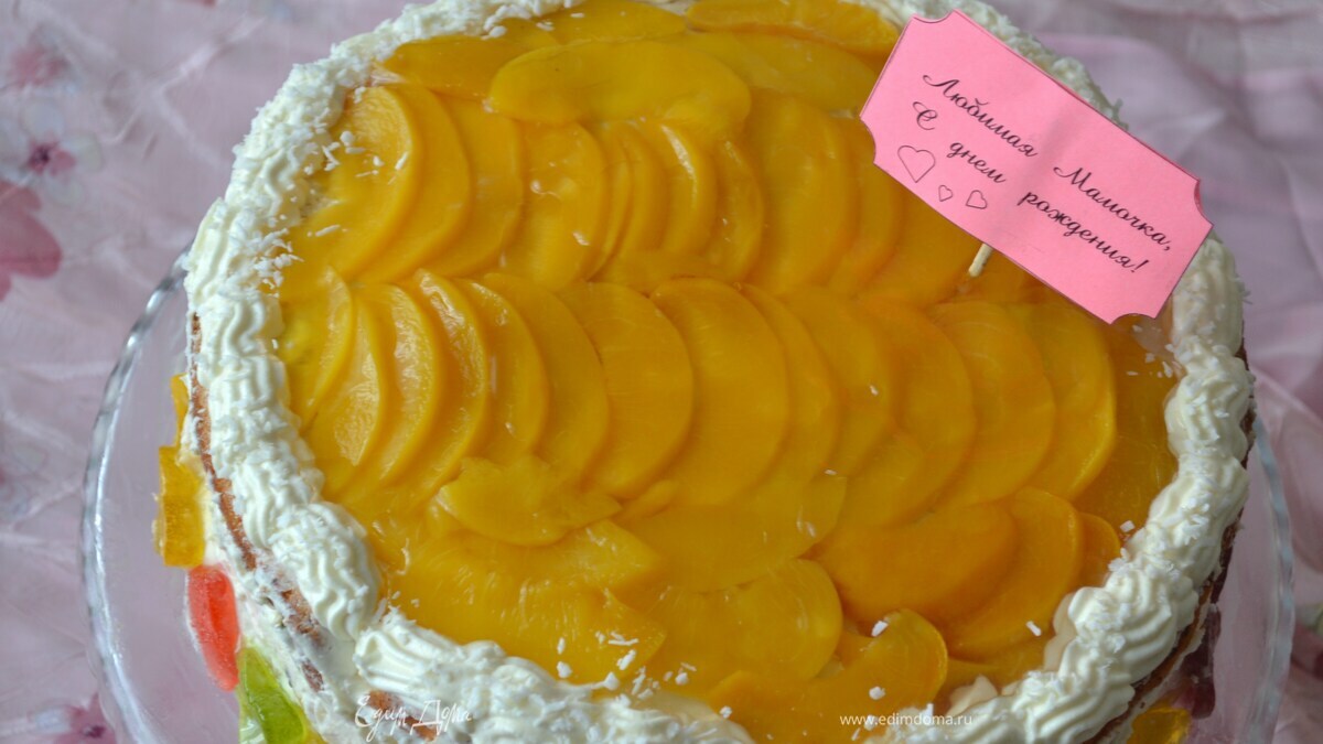 9.Поверх торта разложить нарезанные дольки персиков,с нахлестом друг на друга. - Шаг 17