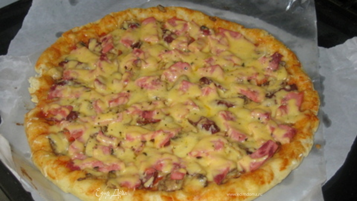 - Шаг 1Начинка для пиццы: Начинку кладём в произвольном количестве. Ветчину нарезаем небольшими полосочками, охотничьи колбаски на кружочки. Сыры натираем на крупной тёрке. Помидоры нарезаем кружочками. Шампиньоны кладём на разогретую сковороду без масла и сразу же накрываем крышкой и даём потомиться примерно 3-5 мин. Затем основу из теста намазываем кетчупом или томатным соусом. И выкладываем начинку, посыпаем щедро сыром и отправляем в духовку при 200С на 5-7 мин. Не пересушите, ведь тесто тонко раскатано. Готово! Безуууумно вкусно! А как ароматно!