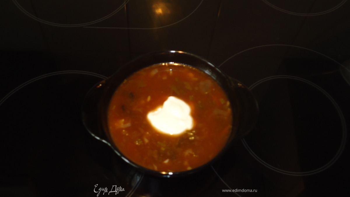 - Шаг 6суп наливаем в чашку и ложку сметаны