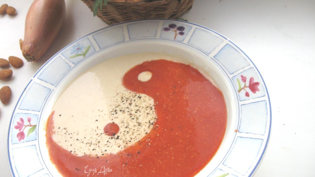 Машина мчалась из Барселоны в небольшой провинциальный городок на юге Испании. Два часа дороги и долгожданный отдых, мои «испанские каникулы» начались. Место моей трапезы в отеле, где в то время отдыхали большей частью сами испанцы, было предметом особой любви и гордости владельца отеля. Метрдотель, встречавший Гостей у порога, был сеньор с горящими глазами цвета маслин и выправкой кабальеро. По всему чувствовалось, что на кухне происходит священнодействие; мелькали белоснежные тарелки, откуда-то из недр появлялись хамон, шикарные морепродукты, паэлья, оливки, незабвенный гаспачо, из окна виднелись разноцветные зонтики, под которыми постояльцы неспешно наслаждались сангрией. К гаспачо отношение здесь особое, и когда кто-то из нас в ту нестерпимо-знойную пору обходил его стороной, заказывал привычный горячий суп – глаза у персонала расширялись и в воздухе витал вопрос, вернее немой крик души: как можно, ведь такая жара, а гаспачо так чудесен…Приготовленный мною суп - признаание в любви этому замечательному поизведению испанского кулинарного искусства. Перед вами - два вида испанского супа, нашедших гармонию в одной тарелке. Один из них - ахобланко, чья история отсылается к временам существования Римской Империи (тогда еще в Европе и помидор еще не было), называют «белым гаспачо», состав его компонентов ограничен: хлеб, молотый миндаль, чеснок, вода, оливковое масло, соль и иногда уксус. Хотелось бы побывать в городке Альмачар, когда там проходит фестиваль ахобланко (2 сентября). Еще совет, без которого не обойтись - не добавляйте лед в гаспачо, иначе испортите атласную структуру супа, просто хорошо его охладите.