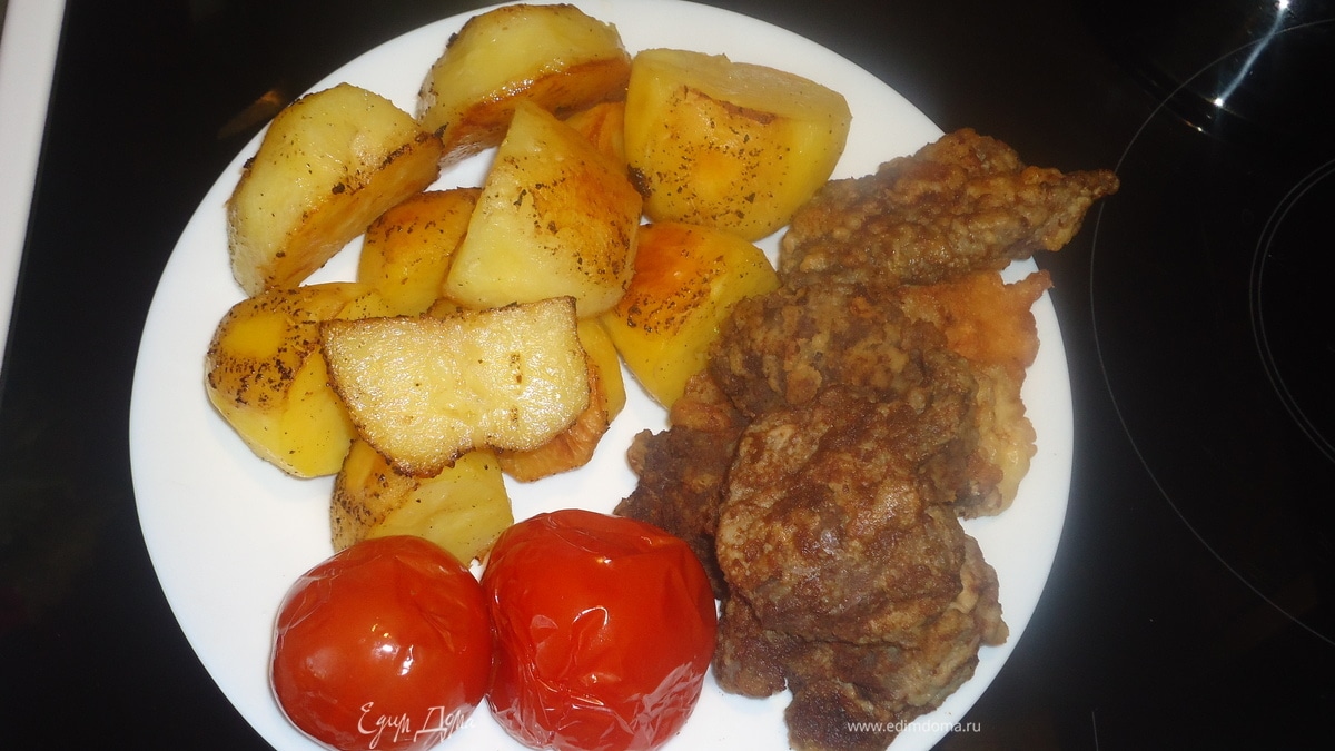 - Шаг 5картошку выкладываем на тарелку з боку выкладываем мясо и пару соленых помидор и можно украсить укропом и петрушкой