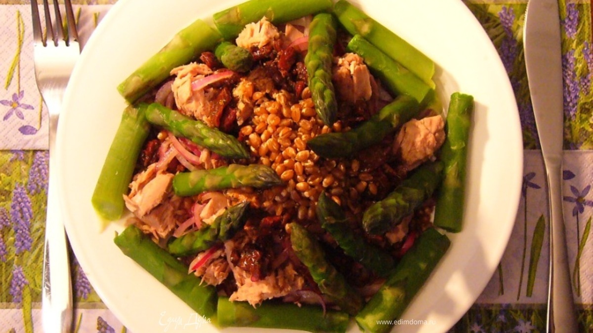 - Шаг 3Составляем салат. Горкой выкладываем пшеницу, на неё маринованный лук, порезанные вяленые томаты и тунец, ну, и конечно же, спаржу. Теперь можно поперчить, посолить, полить оливковым маслом и украсить тёмным бальзамическим соусом.