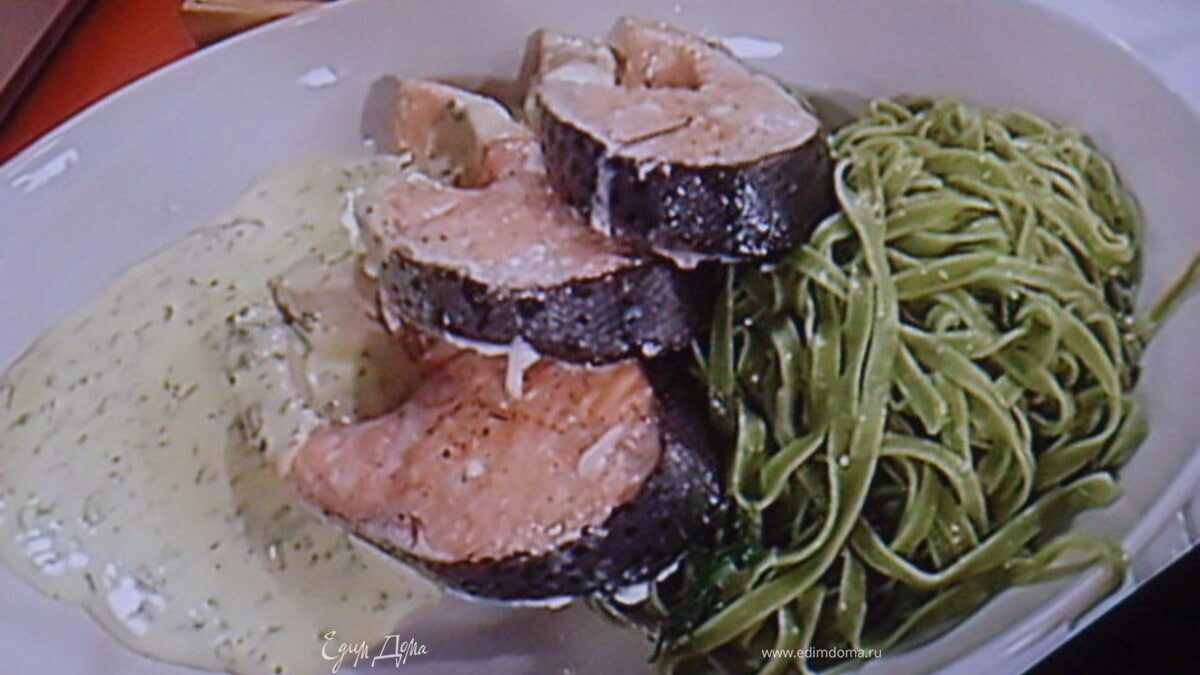 Стейки лосося на зеленых тальятелле под щавелевым соусом