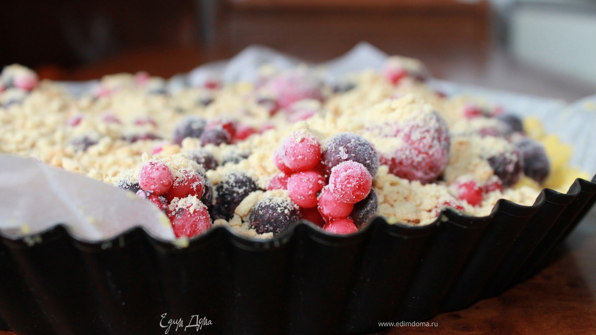 Перед выпечкой достать тесто, размять руками, и раскатать в паст. Выложить в форму, распределить ягодный коктейль и посыпать, измельчённым в блендере, печеньем. Отправить в разогретую духовку до 220-240 С и выпекать до золотистого цвета.
