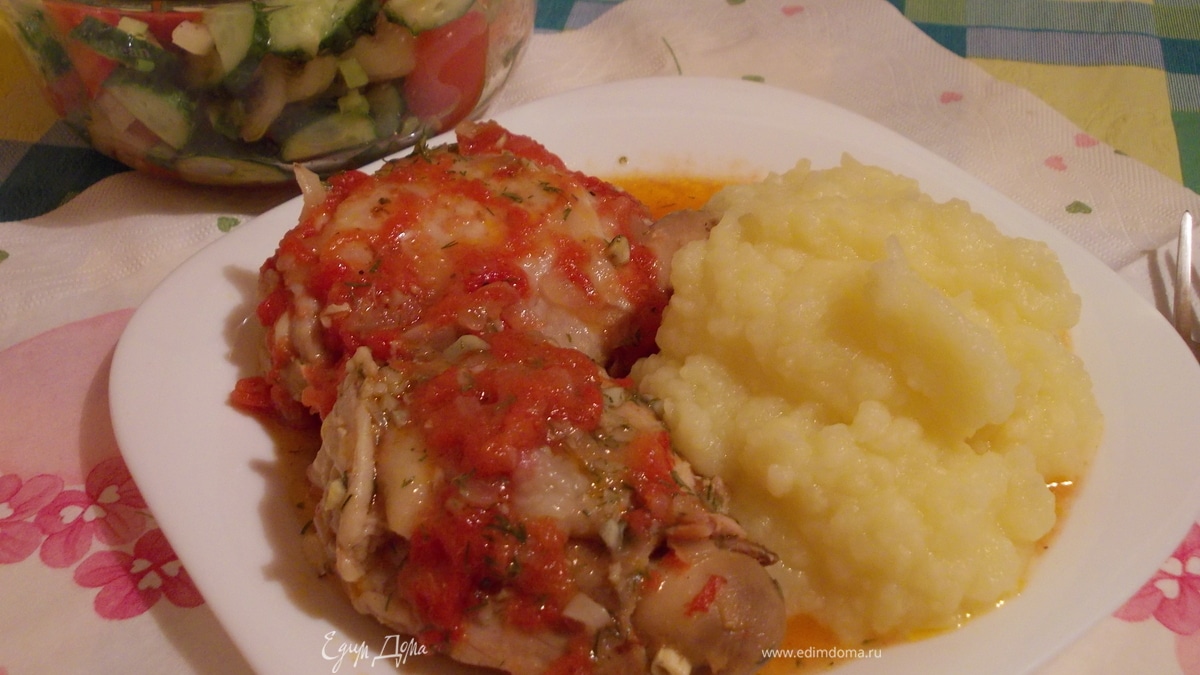 - Шаг 2Снять крышку, подрумянить курицу опять же в собственном жире, добавить лук и помидор, протушить минут 10-15. Посолить, поперчить, выключить огонь посыпать зеленью и чесноком. Очень вкусной получается подливка. А еще всем нравиться, что не лишнего масла (для обжаривания, например). Зелень можно использовать по вкусу - в грузинской кухне очень любят кинзу.