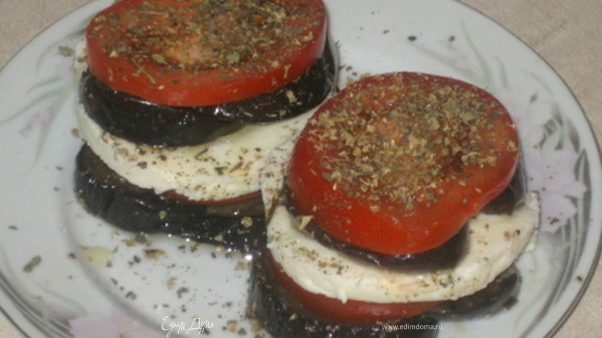 - ПодготовкаПомидоры, сыр нарезать кружочками. Выкладываем на тарелку на которой будем запекать башенки, сначала большой кружочек баклажана, кружочек помидора и обильно посыпаем сушёным базиликом и орегано. Затем кладём сыр, баклажан и опять помидор.