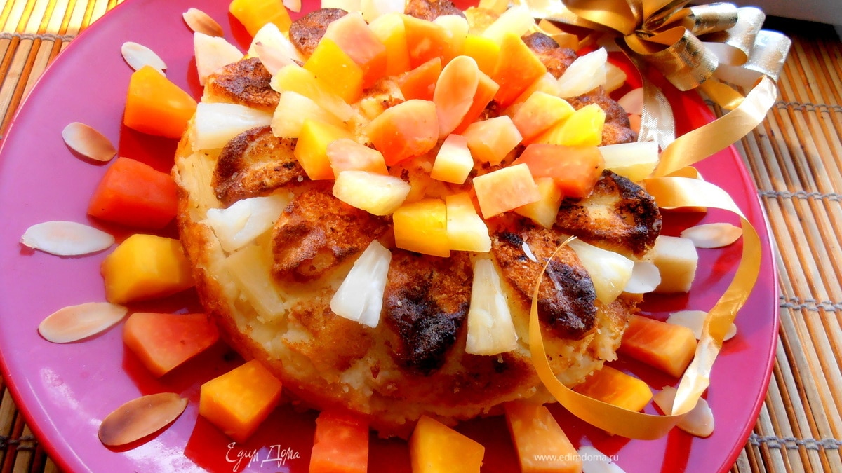 Украшаем оставшимися кусочками фруктов и орешками!!! Отличное сочетание получилось экзотических фруктов с русской манкой))) Нежнейший десерт даст насладиться Вам манной кашей в новом неизведанном вкусе!!! Угощайтесь,друзья!
